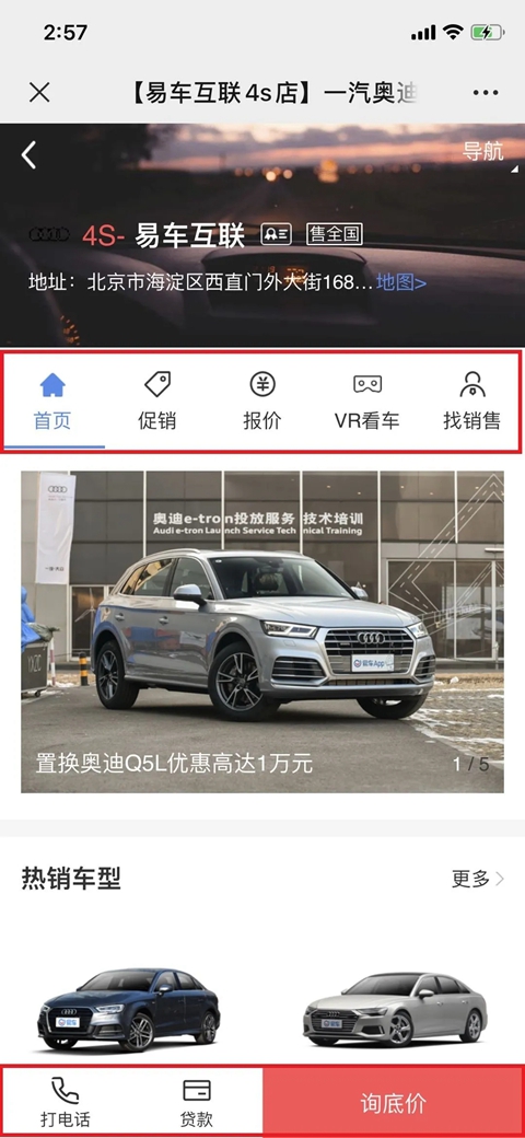 “移动版会员页”是名副其实的“掌上4S店”。可满足客户对经销商在售车辆、车型报价、促销政策的全面了解;还能帮助客户通过“留资”、“微聊”、“致电”三种方式和经销商做进一步沟通。此外,“移动版会员页”同样内嵌了【VR看车】功能。