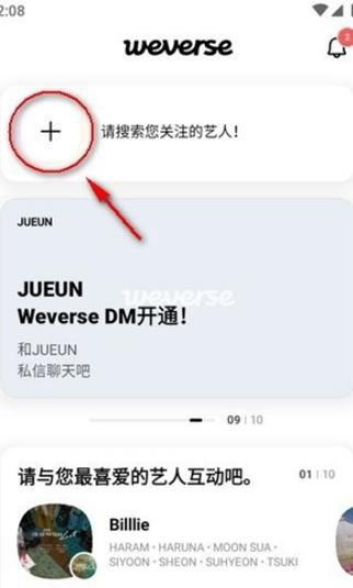 1、打开Weverse,在“主页”点击最上面的“+请搜索您关注的艺人!”,输入你要退出取关的明星艺人,点击进入详情去查看具体操作部分。