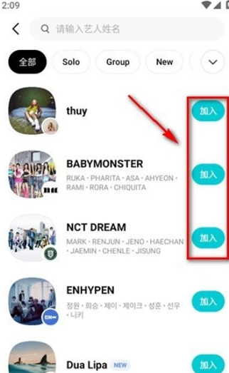 2、接着选择想关注的艺人,输入艺人姓名或是直接按照默认筛选的条件加入就行。