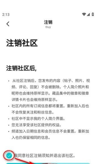 5、完整查看注销说明,勾选“我同意社区注销须知并退出该社区”,确认退出并取消当前所在艺人社区。