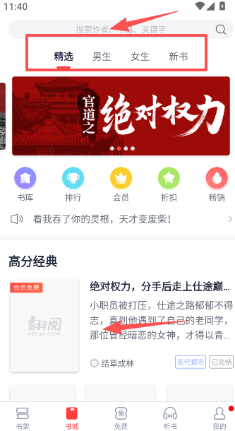 2、在书城栏目按作者、书籍或是关键字的方式搜索,点击精选、男生女生新书分类,查看自己喜欢的小说,点击对应版块进行详情观看页面。