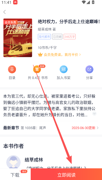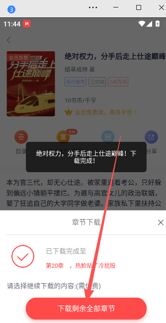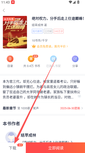1、点击小说封面进入阅读部分,可在详情介绍部分选择下载。
