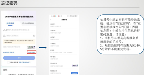 如果考生遗忘密码不能登录系统,请点击“忘记密码”,在“重置志愿填报密码”页面(界面如下图、中输入考生信息进行密码重置。请注意: