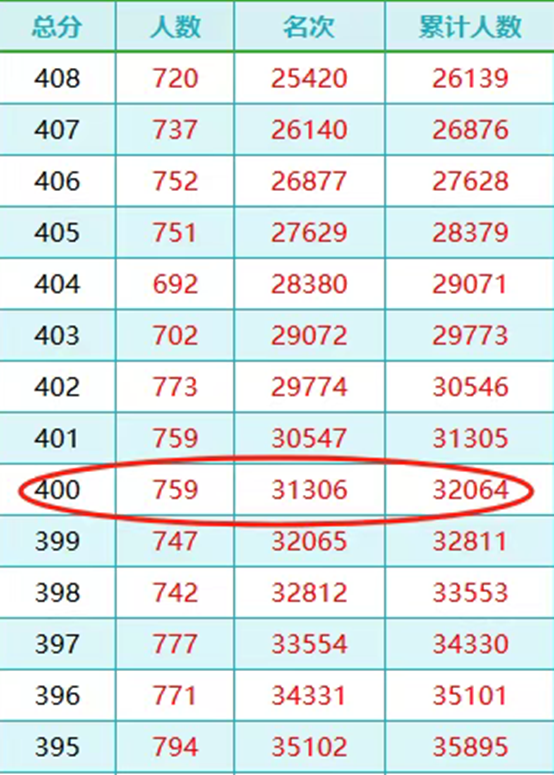 累计人数:指的是这个分数段上的人数累加。比如总分400分的累计人数为32064,表明400分以上的人数共有32064人。