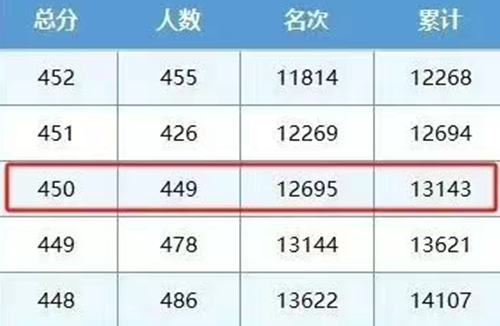 通过查看当年的一分一档表,考生可以确定自己分数对应的名次。例如:广西2025年某单招考生分数为450分,对应的同分人数为449人,名次排12695名,对应的累计人数是13143人,说明广西2025年单招考生中,有13143人的分数≥450分。