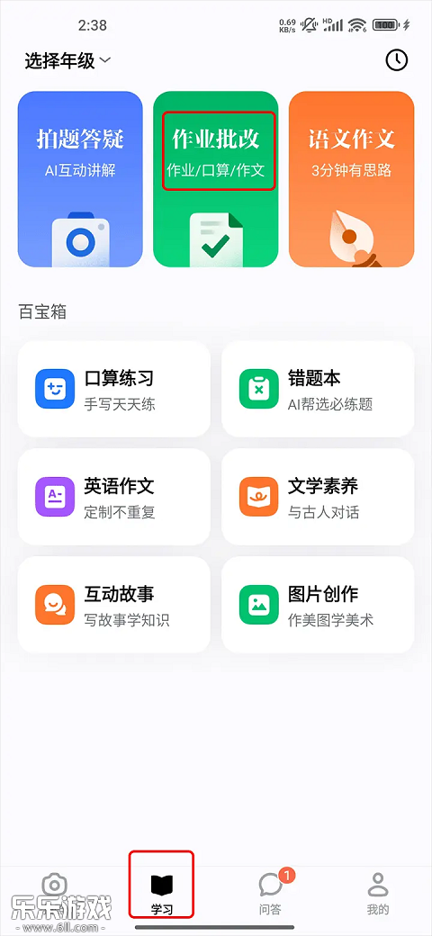 1、打开作业批改宝app,点击【学习】选择【作业批改】。