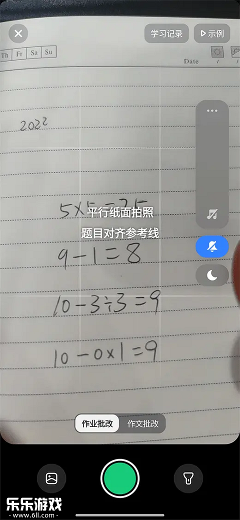 2、平行纸面拍照,题目对齐参考线后点击拍照,主要支持作业批改和作文批改。