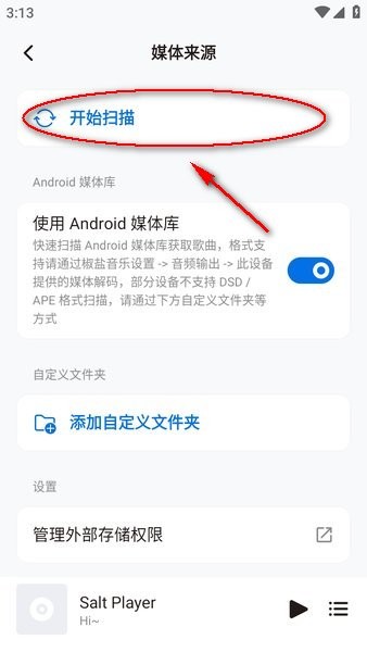 来到“媒体来源”,可以直接点击“开始扫描”,或者点击“添加自定义文件夹”,扫描指定文件夹;