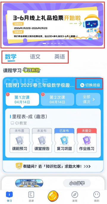 2、点击首页上方,可浏览极客的近期活动,惊喜满满。家长还可根据孩子具体情况,对学科/班级进行切换。