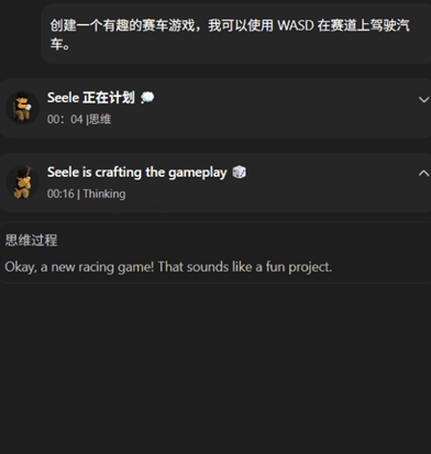 3、输入完成之后,软件各项就开始紧锣密鼓的运行起来了,从设计游戏玩法、搭建场景、创建角色,到设定角色视角、生成UI界每一步都在自动完成。