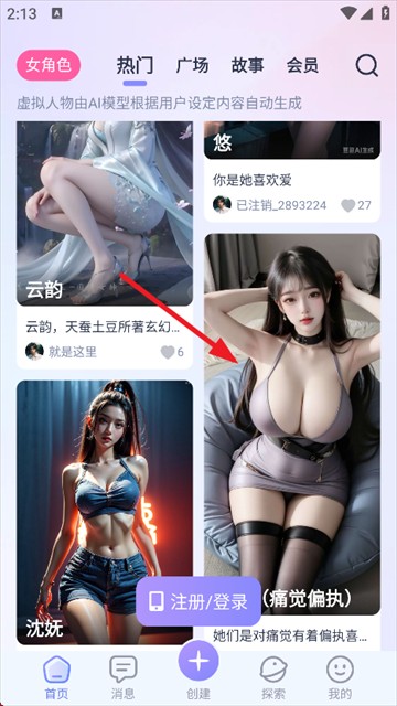 1、在首页找到自己想要聊虚拟聊天对象,按照热门、广场、故事和会员的几种类型去筛选。