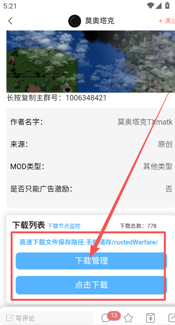 3、下载内容贴至最底部,找到下载管理选项,并点击下载该mod模组。