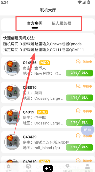 2、按照上图给出的方法,去创建房间,输入对应指令开启,在官方房间或是私人服务器中创建。