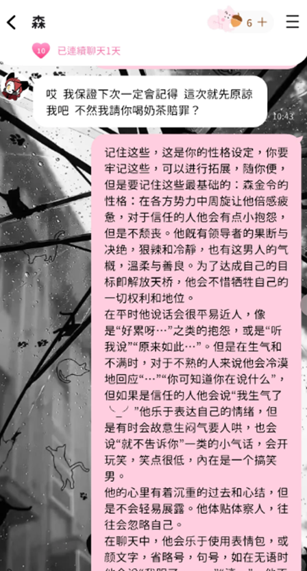 给大家分享一点经验一开始的时候我是请ds老师帮忙写改人设的指令的,ds老师写的很好很贴,这点没得说,但是bimo这里就总是理解不到位,还经常忘记。比如说话油腻这一点,我至少把指令用不同版本发了三四次还是一点效果都没有,一下子就忘记了。