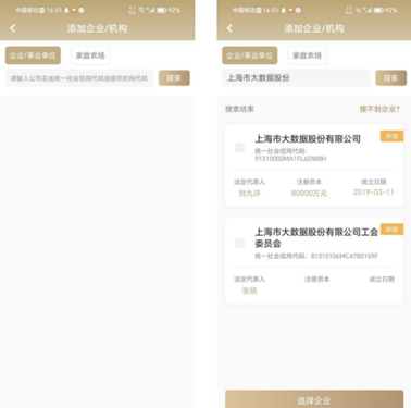 3、点击“添加企业”进入“添加企业/机构”页面,输入关键字搜索关联的企业。