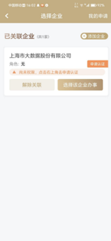 4、勾选企业,点击“选择企业”按钮,即可完成企业添加,后续进行申请认证完成角色绑定。