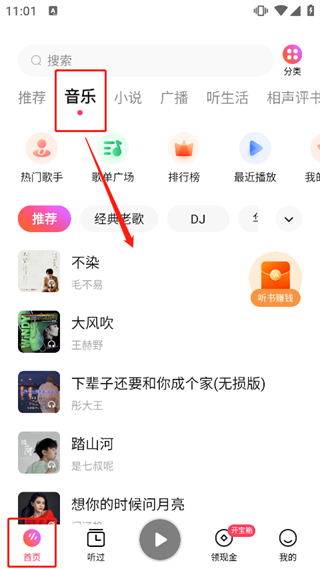 1、进入app“首页”在“音乐”分类内找到需要下载的目标音乐,点击进去歌曲详情播放页面。