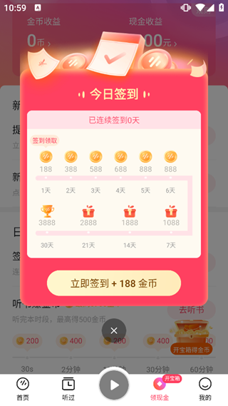 听书赚钱变现:新人注册领红包,每日签到、听书、开宝箱赚金币,33000金币=1元,支持实时提现。