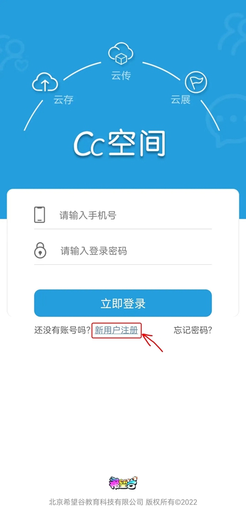 打开CC空间APP,点击箭头所指“新用户注册”,接下来按提示操作即可。