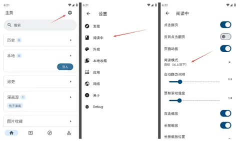 3、导入软件后还需要一个操作才能更好的使用,点击首页右上角的设置按钮,然后选择阅读中,将阅读模式改一下,念心推荐改成“连续(从上到下)”这个模式,然后就是跟其他软件一样的上下拼接翻页模式了,这样体验会好不少。