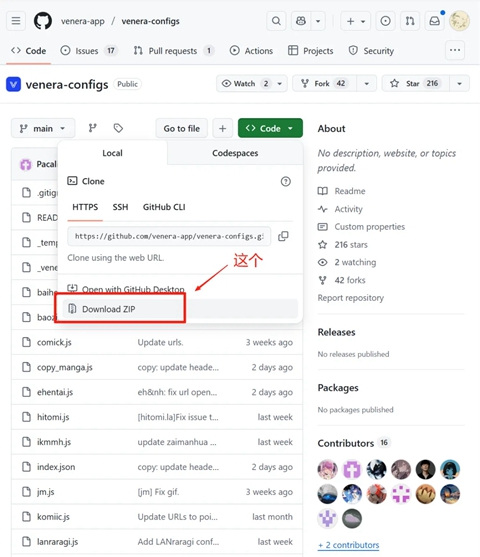 1、导入漫画源也很方便,直接进入漫画源仓库(地址:https://github.com/venera-app/venera-configs),点击“code”按钮里的Download Zip下载解压,