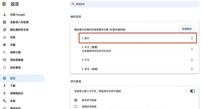 2. 将浏览器切换为英文版抢票,interpark系统有时候会阻挡中文浏览器抢票,开启网页浏览器后,可以进到系统「设定」,找到「语言」,将「偏好语言」中的英文移到第一顺位。