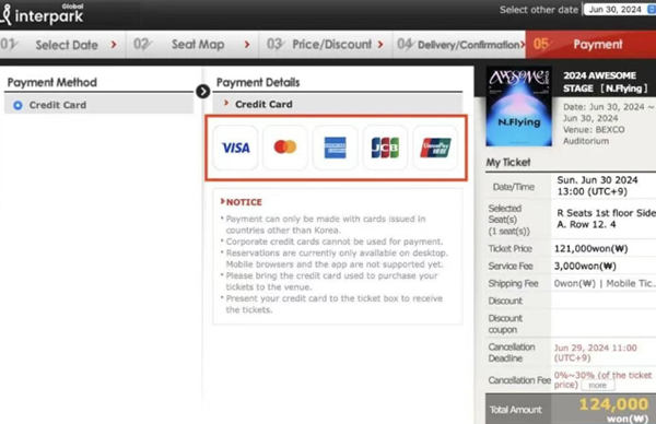 interpark global国际版现在使用海外版只会单纯显示可使用的卡别 (Master、VISA、JCB、American Express、中国银联 ),不需要特别选择。