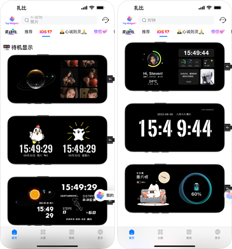 打开应用后,选择iOS17分类。这里就可以选择你喜欢的待机显示样式。这里可以选择的样式非常多,有照片轮番显示、星球元素、时钟、卡通形象、数据面板、充电状态等。