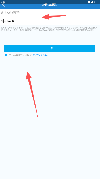 2、输入需要身份证识别的用户姓名及身份证号码,点击下一步。