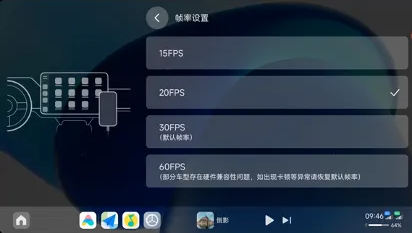百度Carlife通道尊重增帧率设置。设置,显示设置帧率设置中,可以选择15帧、20帧、30帧和60帧。