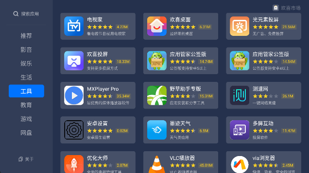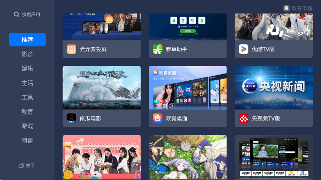 欢喜市场app是一款专业的电视应用盒子软件,通过该应用能够很好的满足大家的盒子应用下载需求,在这里也是可以获取到各大适配电视的应用的,能够给大家带来不错的电视盒子使用体验,如果您想要一款集合了众多电视应用的盒子,现在就来下载使用吧!