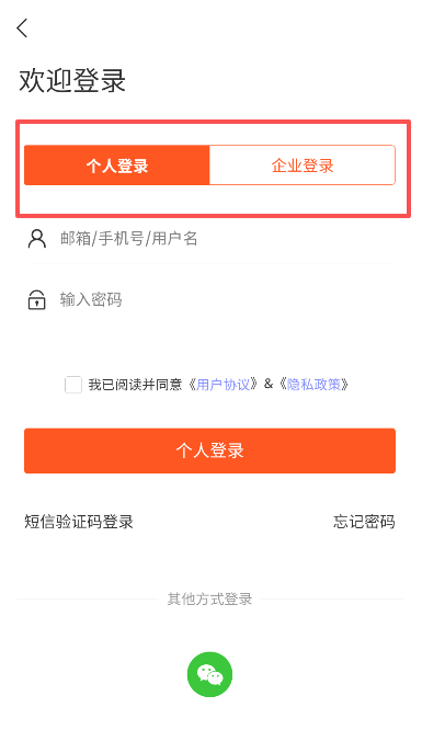 1、登录身份选择个人、企业登录,不同登录方式,所提供的用户界面不同,个人主求职,企业主招聘。