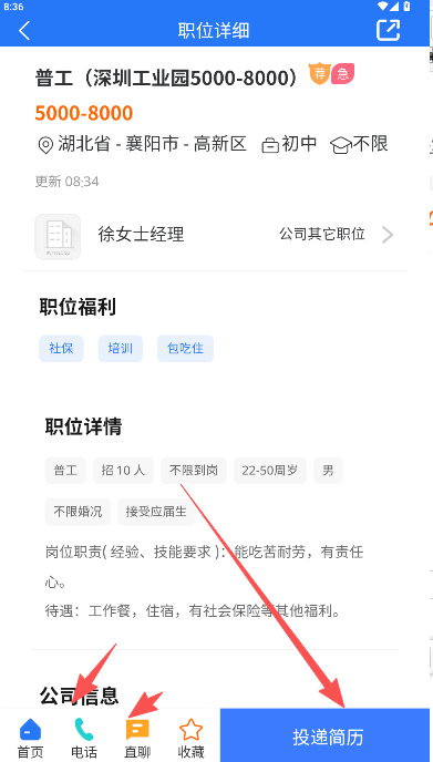 5、有自己感兴趣的公司岗位,可添加收藏投递简历,待企业回复后,可以选择在线直聊或是电话的方式完成求职沟通,以满足自己的求职需要,看是否达标。