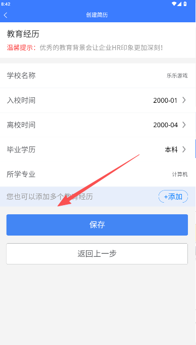 5、最后,来到个人教育经历,为适应现代企业工作发展,个人学历部分是必不可少的,也是最为重要的,添加自己的大学经历以及其他教育经历,只要是有的都是加分项。