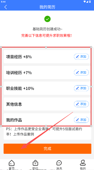 6、基础简历创建完毕以后,软件内还会根据你所编辑部分,做出针对性建议,可依照它所给出的提示完成修改发布。