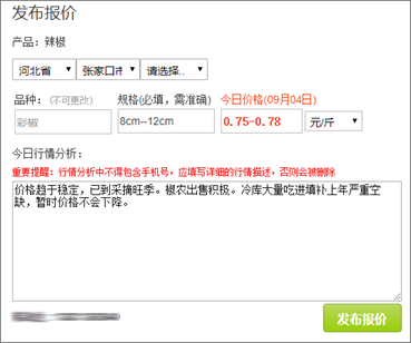 c、今日价格:填写当前时间的价格值,可以是小数、整数,可以使用中杠表示价格区间,例如:1.8-2.2,不得填写其他符号。未上市产品,没有当前价格或存在预判价格,不得发布报价,否则系统会判定为“虚假”报价。
