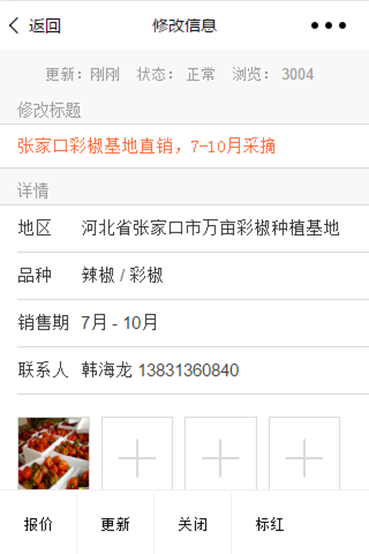 a、产品(如辣椒)、品种(如线椒)、联系人和电话不能修改,需要修改产品品种,建议重新发布并关闭当前产品,如需修改联系人,请联系客服;