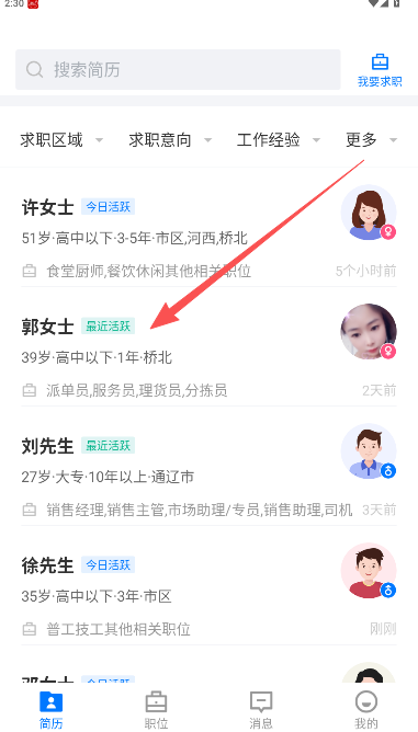 1、在通辽团人才网app客户端的简历页,点击查看有意向的求职者简历打开。
