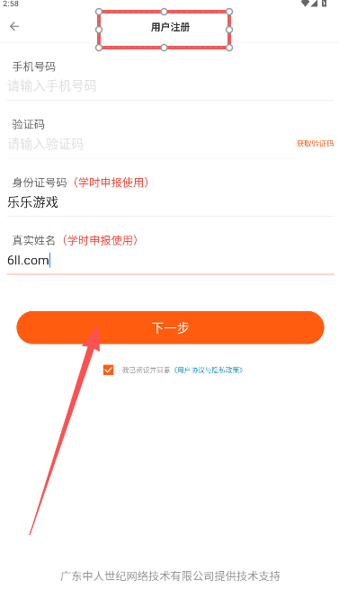 2、来到用户注册页面以后,输入个人手机号码、验证码、学时申报时所要用到的身份证号、真实姓名等有效信息。