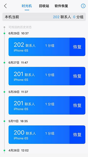随时找回:随时可在月光宝盒中,通过回收站或时光机找回找回误删的联系人