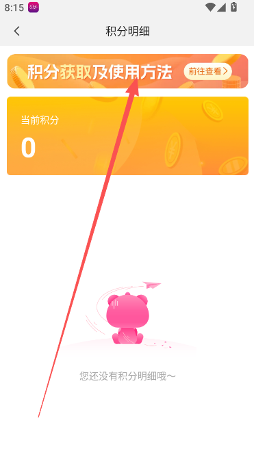 2、在积分明细界面查看积分获取及使用方法,点击前往查看。