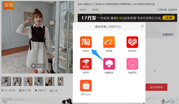 1、在17zwd app搜索您喜欢的宝贝,将鼠标移到宝贝图片即显示相应的功能,点击“一键上传”,选择“传淘宝”。