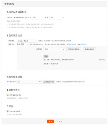 4、根据您的需求设定模版,然后启动模版,点击“保存”,下次发布宝贝时会按照模板的信息由系统相应填入。