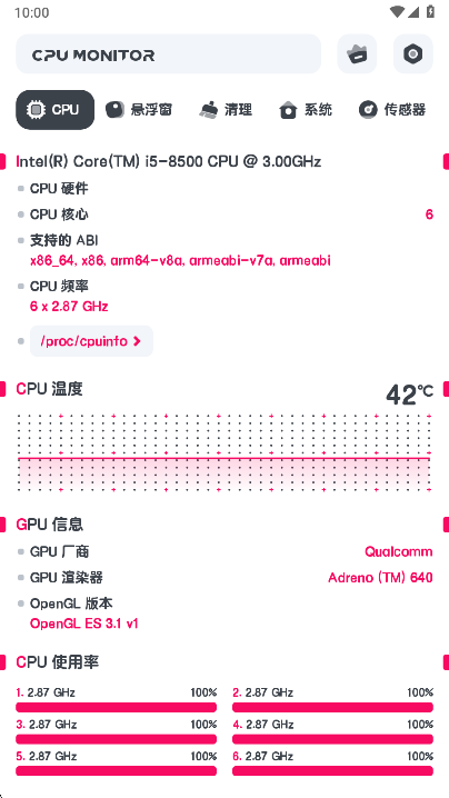 一款非常强大漂亮的 CPU 监测软件,你可以同时监测 CPU 的温度和频率信息,并且可以对 CPU 温度和频率的历史信息就行统计。CPU监测提供各式各样的小工具,包括:一键加速、内存小部件、CPU 小部件、电池小部件、桌面悬浮窗、状态栏悬浮窗、高温警报,你可以通过各种小工具非常方便的监测各种信息