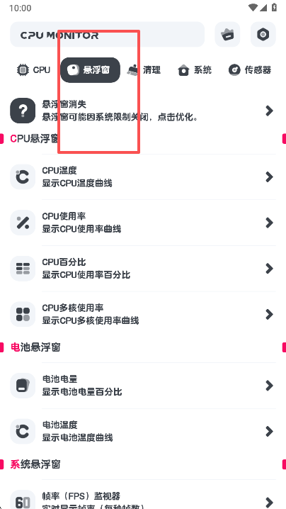 2、接着按照自己的需求开启相应的硬件检测悬浮窗并赋予软件悬浮窗口权限即可