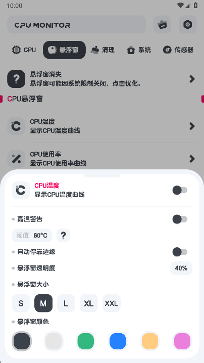 桌面悬浮窗和状态栏悬浮窗实时展示 CPU 温度、电池温度、内存使用率,强大又方便,实时信息想看就看。