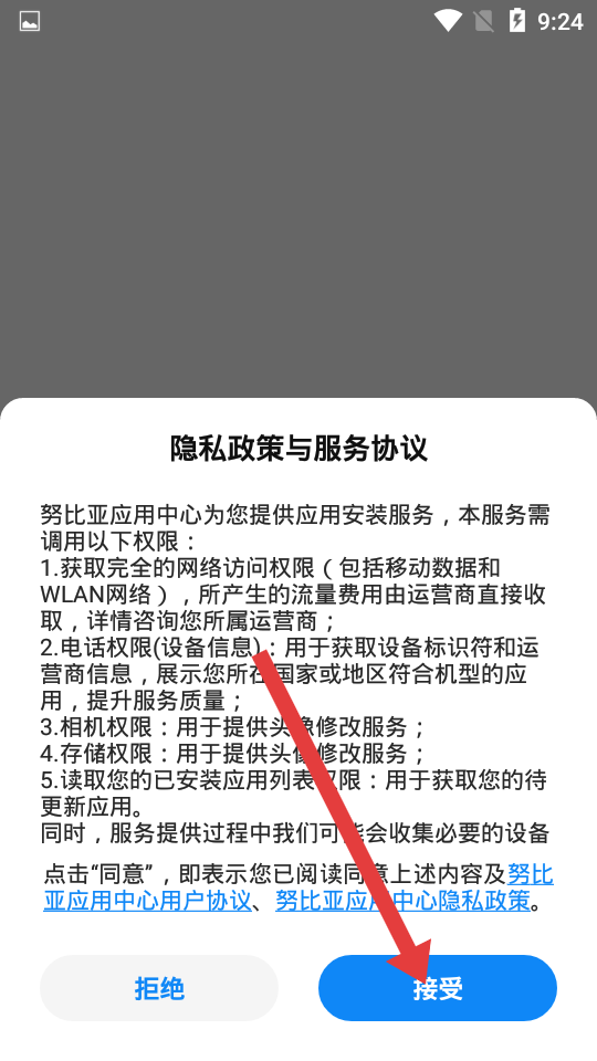 首次打开APP,阅读《隐私政策与服务协议》后点击“接受”,进入应用。