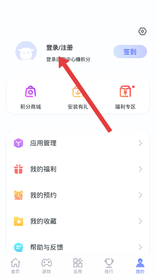 2、在我的页面找到登录注册选项并点击,该入口可引导进入账号登录流程,登录后能享受赚积分、使用积分商城等专属服务,整合个人在应用商店的相关权益与功能。