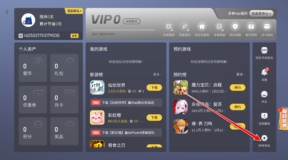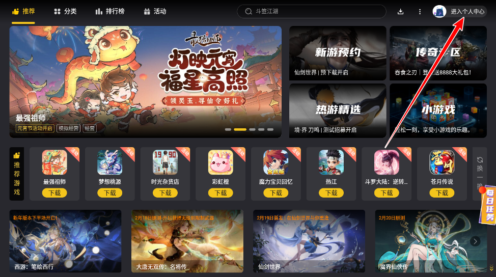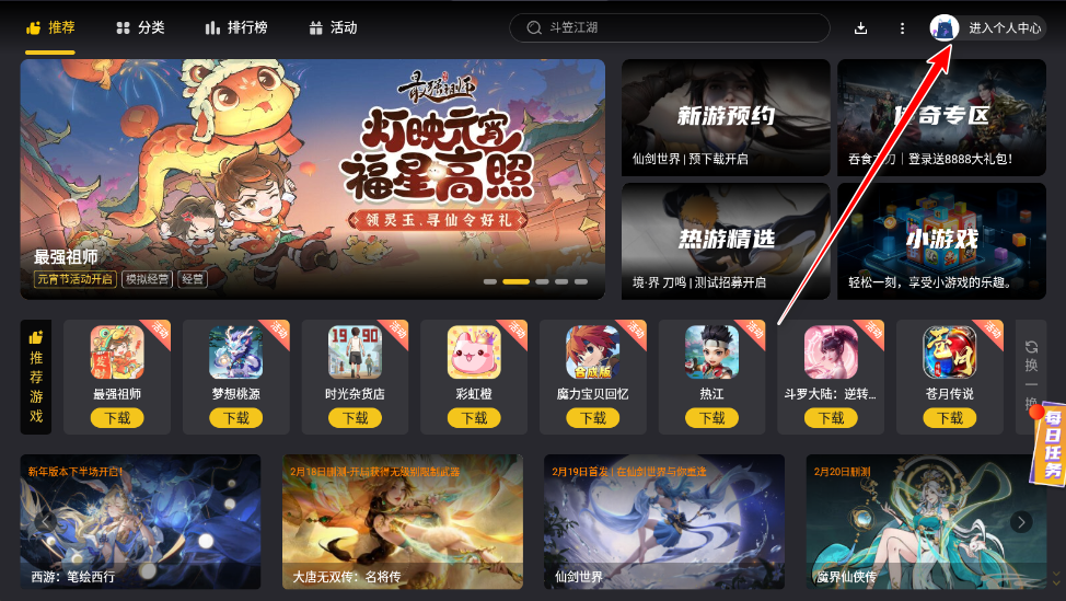 1.打开雷电游戏中心,点击右上角的进入个人中心