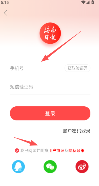 2、阅读并同意用户协议和隐私政策,输入用户个人手机号码以及短信验证进入。